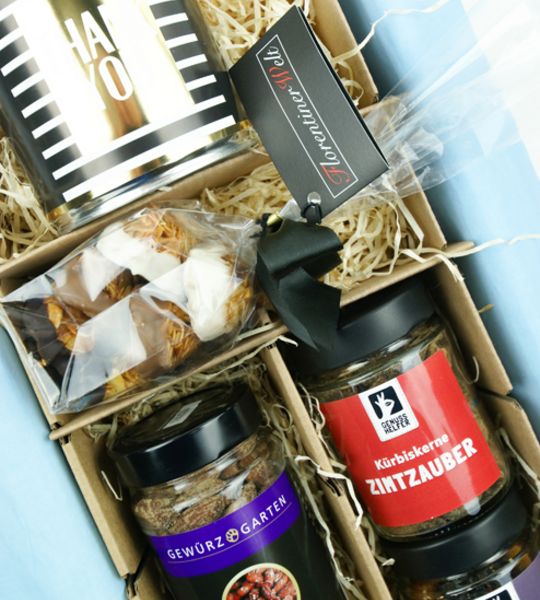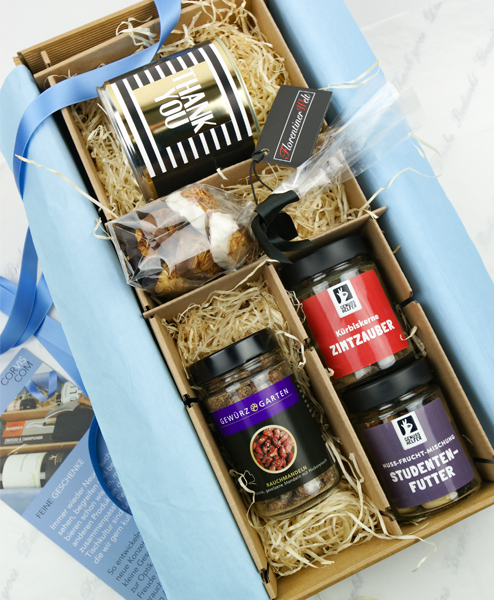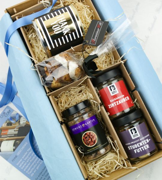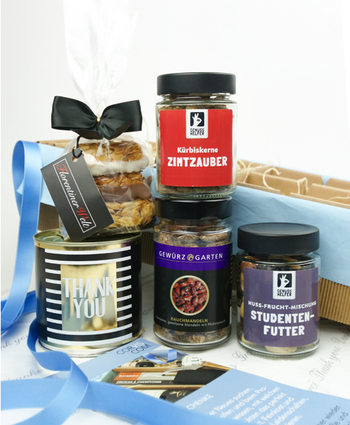 Sie möchten Ihrem Team mit mehreren Mitarbeitern gemeinsame Freude machen und einfach mal „Danke" sagen, dann ist dieses Teampaket genau richtig. Hier haben wir verschiedene Leckereien zusammen gestellt, die man gut teilen kann und alles mit dem Zitronenkuchen in der „Danke" Grußdose gekrönt. Da ist für die Abteilungsfeier auch direkt die Kerze mit dabei.