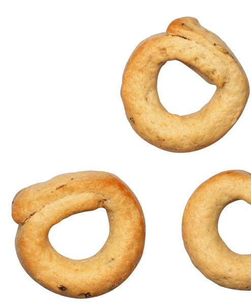 Im Teig des Traditionsgebäcks aus Apulien sind Weißwein und Olivenöl verarbeitet. Das macht die robusten Kringel besonders knusprig. In dieser Variante ist zudem Rosmarin als feines Gewürz verwendet. Die passen zu Ol und Salz genauso gut wie zu Wein oder einfach pur zum Knabbern.