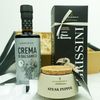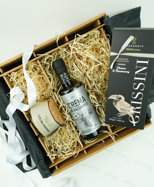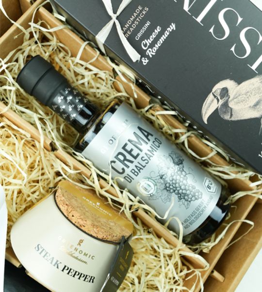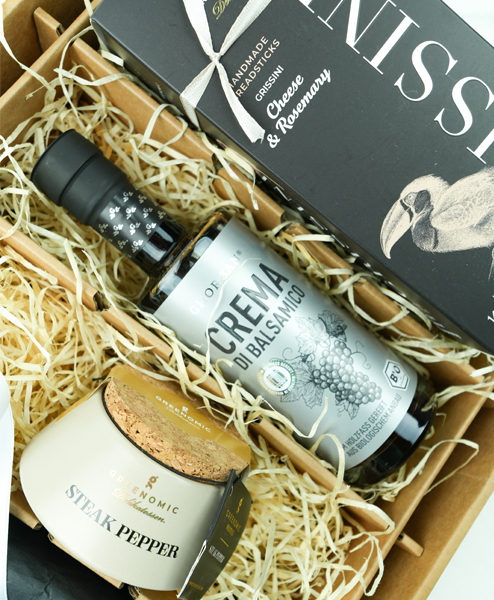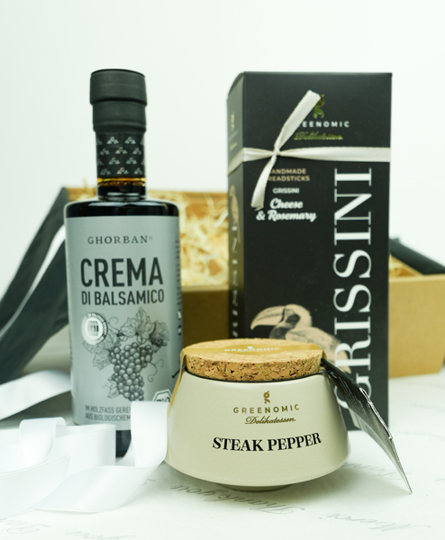 In der Garderobe ist das kleine Schwarze der elegante Klassiker mit feinem Understatement. Hier haben Sie ein Geschenkpaket, das optisch und inhaltlich die kulinarische Parallele ist. Hier ist nicht nur die Farbe auf Eleganz abgestimmt, sondern auch die Produkte. Die Grissini bilden die Overtüre, weiter geht es mit einem schönen Salat, der mit der Crema di Balsamico verfeinert wird und dann kommt das Hauptgericht, gewürzt mit dem Steakpfeffer aus champagnerfarbenen Tontopf. Das ist ein feines Statement mit Stil.