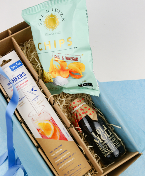 Mit dem Geschenkpaket „Viva España" haben wir das Sommerfeeling der Strandpromenade von Barcelona für Ihre Kunden oder Mitarbeitern eingefangen. Der Sangria von Lola Mola iost nicht nur ein Hingucker, sondern überzeugt durch Geschmack und Qualität. Er wird aus Tempranillo Wein und Valencia Orangen hergestellt und nur mit Rohrzucker gesüßt. Mit den Sicherheitstrinkhalmen von Koziol, lässt sich der Sangria dann unbeschwert und nachhaltig genießen. Die Kult-Chips von Sal de Ibiza sind ein salziger Gegenpol und vervollständigen den Genuss.