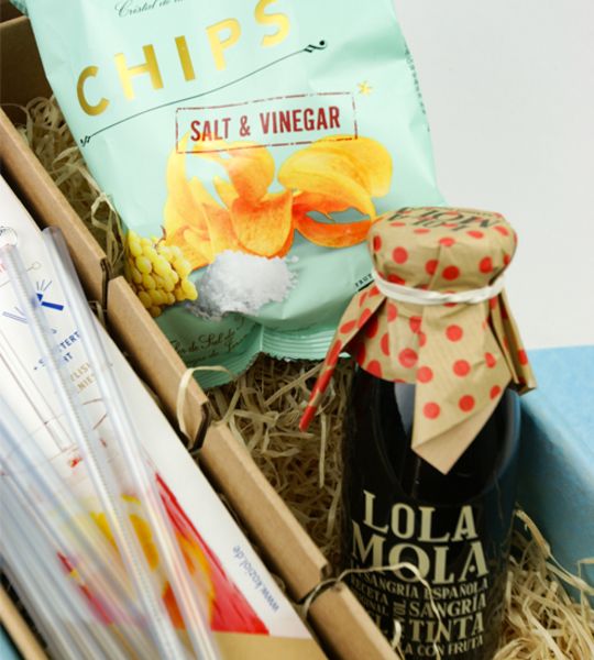 Geschenkbox mit Sangria, Koziol Trinkhalmen und Chips