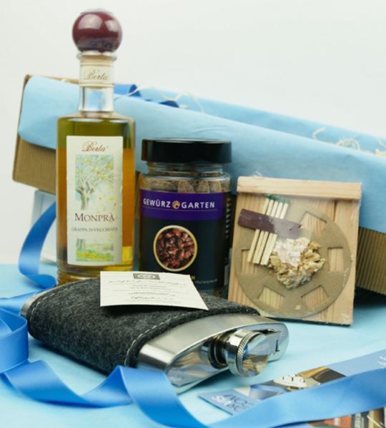 Warm-up ist ein vielseitiges Kunden- und Mitarbeitergeschenk. Beim Wintergrillen wärmt es schon mal von innen, bevor die Kohle mit dem innovativen Feuerstarter zum Glühen kommt. Auf langen Wanderungen oder beim Angeln ist es ebenso hilfreich wie in kühlen Sommernächten. Der schlichte, robuste Flachman aus Edelstahl hat eine stylische Hülle aus echtem Wollfilz, den Sie für Ihre Kunden in Wunschfarbe bestellen können. Ebenso sind Aplikationen oder andere Veredelungen machbar. Der hervorragende Grappa aus der Traditionsdistillerie „Berta” und die genialen Rauchmandeln von Gewürzgarten sind die genussvollen Ergänzungen, die das Warm-up perfekt machen. Der biologische Feuerstarter von Palo ist ein Überraschungsmoment.