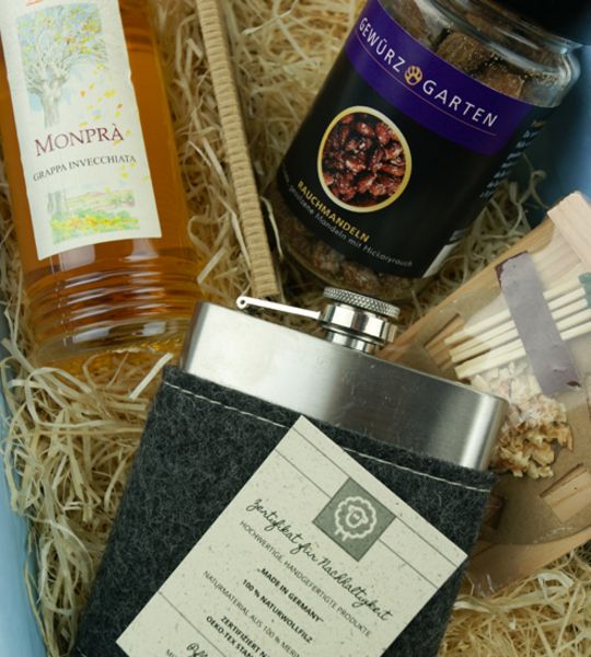 Geschenkbox mit Filzmaxx Flachmann und Palo Feuerstarter