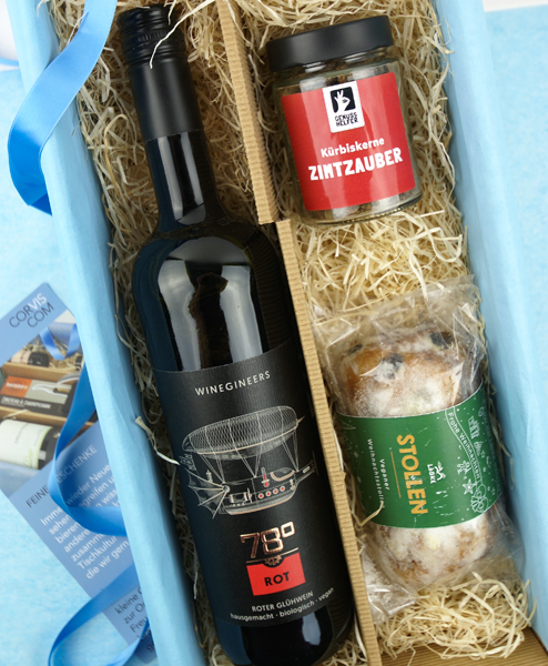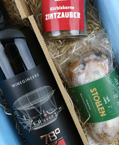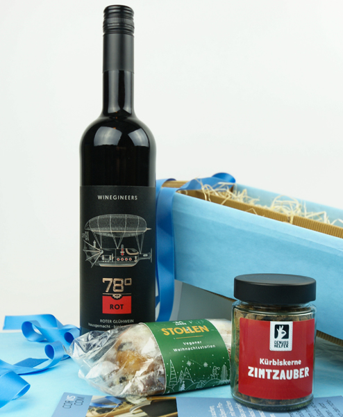 Für dieses Paket nehmen wir nicht irgendeinen Glühwein, sondern den veganen Bio Glühwein von winegineers, der mit echten Gewürzen und gutem Winzerwein bei 78 °C sein Aroma erhält. Dazu gibt es den „Zimtzauber“ vom Bremer Gewürzhandel. Das sind frisch geröstete Kürbiskerne in einem knusprigen Zimtmantel. Die handgefertigten Christstollen vom Hofgut Löbke runden alles weihnachtlich ab. Den gibt es sowohl vegan als auch klassisch.