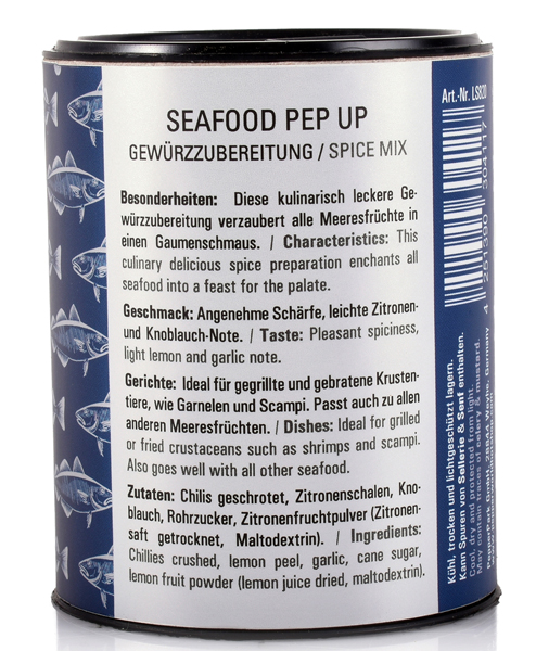 Mit dieser Gewürzmischung verleihen Sie Meeresfrüchten sowie Fisch einen leicht pikanten Pep mit mediterranen Noten. Besonders lecker zu gegrillten Scampi, Oktopus und ganzen Seefischen.
